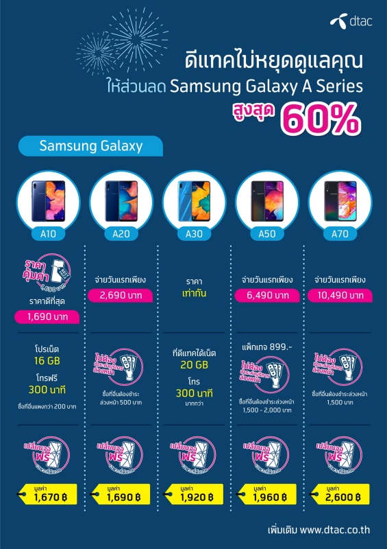 - โปรโมชั่นสุดพิเศษสำหรับลูกค้าที่ซื้อเครื่อง Samsung Galaxy A Series ในราคาพิเศษสุดคุ้ม ลดสูงสุดถึง 60% โดยไม่ต้องชำระค่าบริการล่วงหน้า พบกับ Samsung Galaxy A10 ในราคาเริ่มต้นเพียง 1,690 บาท ฟรี! รับสิทธิ์การเปลี่ยนหน้าจอ 1 ครั้ง ภายใน 1 ปี นับจากวันที่ซื้อเครื่อง โปรโมชั่นพิเศษ ในระหว่างวันที่ 24 พ.ค. – 23 มิ.ย. 2562 นี้