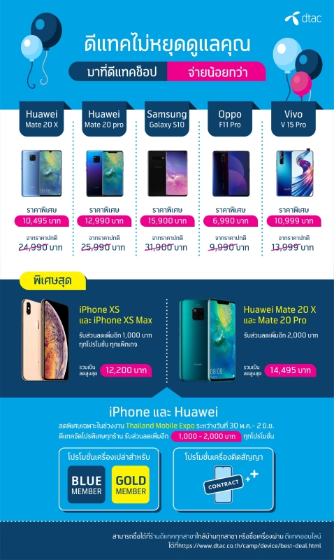 ทั้ง iPhone และ Huawei นี้ลดพิเศษเฉพาะในช่วงงาน Thailand Mobile Expo ระหว่างวันที่ 30 พ.ค. – 2 มิ.ย.ดีแทคจัดโปรพิเศษทุกร้าน รับส่วนลดเพิ่มอีก1,000 -2,000 บาท ทุกโปรโมชั่น ทั้งโปรโมชั่นเครื่องเปล่าสำหรับ Blue member และ Gold member และโปรโมชั่นเครื่องติดสัญญา