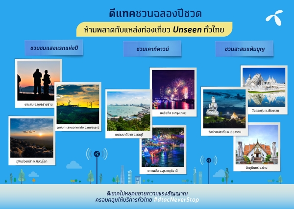 - สถานที่เฉลิมฉลองปีใหม่ยอดนิยม– ดีแทคได้ประเมินสถานการณ์ร่วมกันทั้งทีมงานดูแลโครงข่าย ทีมการตลาด และทีมขาย เพื่อคาดการณ์สถานที่สำคัญในการจัดงานเคาท์ดาวน์และกิจกรรมเฉลิมฉลองตามจังหวัดสำคัญ และดูและเป็นกรณีพิเศษในการติดตั้งเสาสัญญาณชั่วคราว อุปกรณ์เสริมสัญญาณ จัดรถโมบายล์ เช่น ในกรุงเทพมหานครและปริมณฑล ที่ลานด้านหน้าเซ็นทรัลเวิลด์ เมกาบางนา เอเชียทีค ไอคอนสยาม เซ็นทรัลพลาซ่าเวสต์เกต ฟิวเจอร์พาร์ครังสิต เป็นต้น