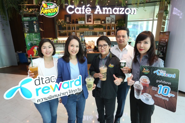 นางสาวเพ็ญพงา สุทธิมณฑล ผู้อำนวยการฝ่ายบริหารลูกค้า บริษัทโทเทิ่ล แอ็คเซ็ส คอมมูนิเคชั่น จำกัด (มหาชน) หรือดีแทค (ที่ 2 จากซ้าย) ร่วมกับ นางสาวนิตยา ธำรงราชนิติ ผู้จัดการฝ่ายธุรกิจคาเฟ่อเมซอน (ที่ 3 จากซ้าย) มอบสิทธิพิเศษให้ลูกค้าดีแทคทั้งแบบรายเดือน และเติมเงิน รับส่วนลด 10บาท เมื่อซื้อเครื่องดื่มแสนอร่อยทุกเมนู ที่ Café Amazon กว่า 2,200 สาขาทั่วประเทศ ตั้งแต่วันนี้ ถึงวันที่ 28 กุมภาพันธ์ 2562 รวมมูลค่ากว่า 2.4 ล้านสิทธิ์ หรือ 24ล้านบาท ลูกค้าสามารถกดรับสิทธิได้เลยจากมือถือ