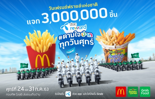 ดีแทค รีวอร์ดร่วมกับพันธมิตรแบรนด์เฟรนช์ฟรายส์ยอดนิยม McDonald’s, Potato Corner คืนความสุขให้กลับมาอีกครั้ง กับแคมเปญ ตามใจปากทุกวันศุกร์ ส่งความสุขในเดือนกรกฎาคม ในวัน ‘เฟรนช์ฟรายส์แห่งชาติ’ แจกฟรีเฟรนช์ฟรายส์ 3,000,000 ชิ้น เมื่อสั่งเดลิเวอรี่ผ่านแอป GrabFood ครั้งแรกในไทยที่ไม่ต้องต่อคิวซื้อเฟรนช์ฟรายส์หน้าร้าน นั่งรอกองทัพ Grab ที่จะส่งตรงเฟรนช์ฟรายส์อร่อยๆให้เคี้ยวเพลินถึงที่บ้าน กดรับโค้ดได้ในวันศุกร์ที่ 24 และ 31 กรกฎาคมนี้ แล้วเก็บโค้ดไว้สั่งทานวันไหนก็ได้ภายใน 7 วัน นับจากวันที่กดรับโค้ด