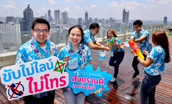นางสาวทิพยรัตน์ แก้วศรีงาม รองประธานเจ้าหน้าที่บริหาร กลุ่มการขายและงานบริการ บริษัท โทเทิ่ล แอ็คเซ็ส คอมมูนิเคชั่น จำกัด (มหาชน) หรือดีแทค พร้อมด้วยร้านค้าตัวแทนจำหน่าย ร่วมฉลองสงกรานต์ปีใหม่ไทย ขอให้ประชาชนเดินทางปลอดภัย และมีความสุขในช่วงวันหยุดยาวนี้ สำหรับลูกค้าดีแทค ที่มาทำธุรกรรมที่ศูนย์บริการดีแทค ในช่วงเทศกาลสงกรานต์ ดีแทคแจกซองใส่มือถือกันน้ำ เพื่อให้ลูกค้าใช้มือถือได้อย่างไร้กังวลและสนุกสนาน เพียงแค่ชำระค่าบริการรายเดือน 500 บาทขึ้นไป หรือ ซื้อสมาร์ทโฟนรุ่นใดก็ได้ พร้อมสมัครแพ็กเกจแบบรายเดือน หรือ เปิดเบอร์ใหม่-ย้ายค่ายเบอร์เดิม พร้อมสมัครแพ็กเกจแบบรายเดือนมูลค่า 500 บาทขึ้นไป ตั้งแต่วันนี้ เป็นต้นไป หรือจนกว่าของจะหมด สำหรับลูกค้าBLUE MEMBER และ เพียงกด *140# โทรออก แล้วแสดงข้อความบนหน้าจอมือถือเพื่อรับสิทธิ์ ที่ศูนย์บริการดีแทคทุกสาขาทั่วประเทศ