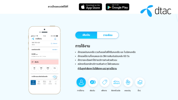 • ดีแทค แอปพลิเคชัน พร้อมให้ลูกค้าใช้บริการได้ตลอด 24 ชั่วโมง เพื่อเช็คค่าใช้บริการ ชำระค่าบริการ เปลี่ยนโปรโมชันแพ็กเกจ สมัครโปรเสริม โดยดาวน์โหลดดีแทค แอป ได้จาก Google play Store สำหรับมือถือแอนดรอยด์ หรือ apple store สำหรับดาวน์โหลดแอปบน iPhone และอุปกรณ์ iOS