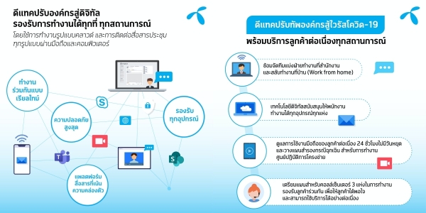 ดีแทคพร้อมรับมือทุกสถานการณ์ที่จะได้รับผลกระทบจากไวรัสโควิด-19 วางแผนรองรับทุกภาคส่วนเพื่อดูแลลูกค้าใช้งานมือถือและงานบริการอย่างต่อเนื่อง นำโซลูชั่นดิจิทัลชั้นนำสู่การใช้งานพร้อมทำงานได้ทุกที่ทุกเวลา พร้อมจัดทดลองแบ่งทีมทำงานแบ็กอัพทุกแผนกเพื่อความต่อเนื่องทางธุรกิจตั้งแต่ระดับผู้บริหารถึงพนักงาน เพื่อแบ่งเป็น 2 กลุ่มในการทำงานที่สำนักงานและปฏิบัติงานจากพื้นที่อื่นหรือทำงานจากบ้าน (Work from home) เพื่อความมั่นใจเดินหน้าต่อเนื่องไม่กระทบการบริการเพื่อลูกค้า