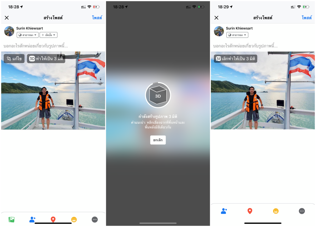 การโพสต์รูปก็ยังทำคล้ายๆ เดิมครับ เพียงแค่สามารถนำรูปในโหมดปกติมาโพสต์เป็นแบบ 3D ได้เลย เพียงแค่เลือกโพสต์สถานะด้วยรูปปกติ จากนั้นจะมีเมนู “3D ทำให้เป็น 3 มิติ” เลือกที่เมนูนี้ ตัวแอป Facebook ก็จะทำการแปลงให้เป็นรูป 3D ให้บน Facebook เหมือนกับการใช้ภาพ Portraits โพสต์ก่อนหน้านี้เลยครับ ซึ่งจะทำให้สะดวกมากๆ ในการใช้งานไม่ได้จำกัดแค่โหมดใดโหมดหนึ่งอีกต่อไป
