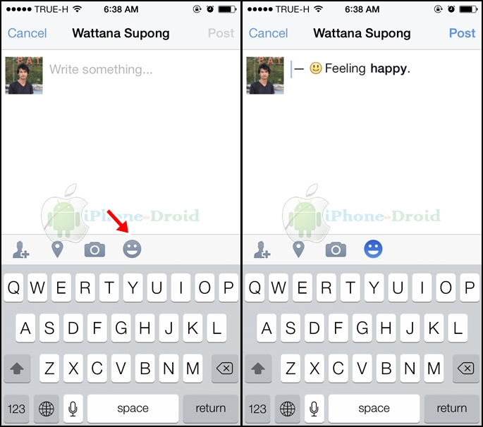 ที่หน้า wall ของเพื่อนที่เราจะไปโพสต์สามารถใส่ไอคอน อิโมจิลงไปได้นะครับแบบด้านล่างนี้เลือกที่หน้ายิ้มเพื่อใส่ได้เลยได้เฉพาะเมนูตัวเครื่องภาษาอังกฤษนะครับ