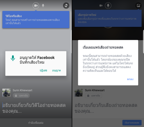 โดยการใช้งานให้เข้าไปที่ปุ่ม Go Live เหมือนกันตอนถ่ายทอดสดเป็นวีดีโอนะครับ จากนั้นจะมีปุ่มไมค์ให้เลือกเพื่อถ่ายทอดสดเฉพาะเสียงเท่านั้น โดยกล้องจะปิดในระหว่างถ่ายที่ถ่ายทอดสด แต่ไมค์จะเปิดทำงานเพื่อแสดงความคิดเห็นและตอบโต้ได้
