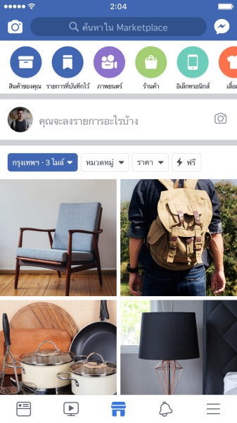 Marketplace จะแสดงสินค้าที่เกี่ยวข้องกับความสนใจของคุณและมีอยู่ในตลาดไทย เพียงแค่แตะที่สัญลักษณ์ Marketplace คุณก็สามารถโพสต์สินค้าเพื่อขายได้โดยตรง หรือโพสต์ข้ามกลุ่มจากกลุ่มผู้ซื้อและกลุ่มผู้ขายได้