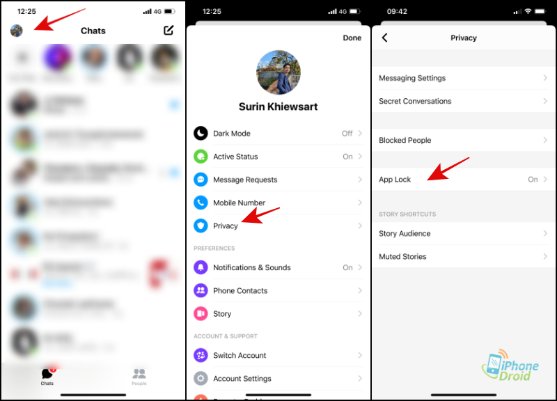 เข้าไปที่ Facebook Messenger > เข้าไปที่ไอคอนผู้ใช้งาน > Privacy > App Lock > On