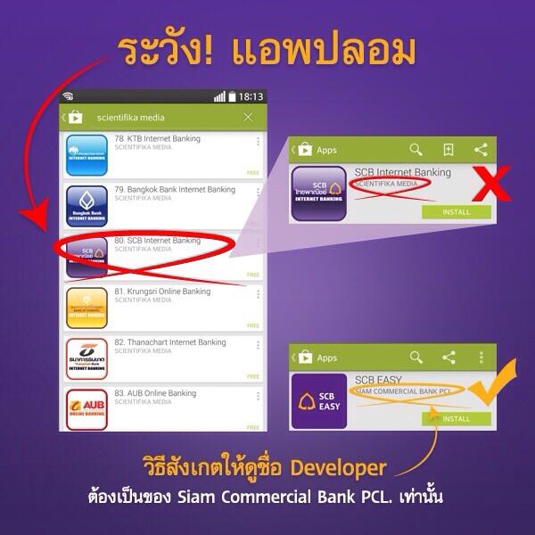 เนื่องจากขณะนี้มีผู้ทำแอพเลียนแบบแอพจากธนาคารต่าง ๆ ซึ่งอยู่บน Play Store โดยที่ธนาคารไทยพาณิชย์ออกมาเตือนแล้วว่าให้ ระวัง! App Mobile Banking ปลอมบน Google Play Store ที่ไม่ได้ทำโดยธนาคาร โดยวิธีการสังเกตนั้นให้ดูได้จากชื่อผู้พัฒนาซึ่งพบว่ามีผู้ผลิตแอพปลอมขึ้นมาหลายธนาคารโดยใช้ชื่อผู้พัฒนาว่า “SCIENTIFIKA MEDIA ” ตามภาพด้านล่างนี้นะครับ ฉนั้นควรระวังเรื่องการดาวน์โหลดแอพจากธนาคารต่าง ๆ หากเป็นของปลอมอาจจะทำให้ถูกขโมยข้อมูลไปได้