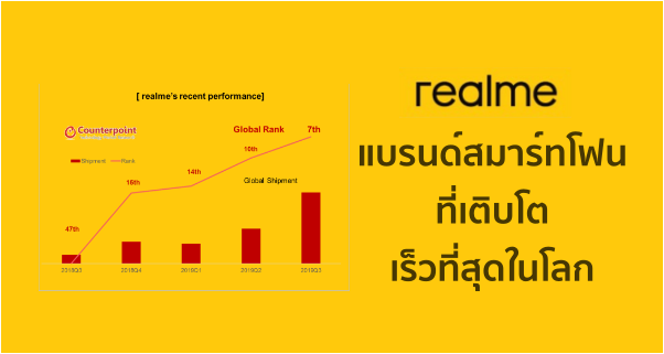 ในปี 2562 realme เป็นแบรนด์สมาร์ทโฟนน้องใหม่ที่ได้รับการยอมรับอย่างมาก ภายในระยะเวลาเพียง 18 เดือน realme ได้ก้าวเข้าสู่อันดับ 7 ของแบรนด์สมาร์ทโฟนที่เติบโตเร็วที่สุดในโลก และเมื่อวันที่ 31 ธันวาคม 2562 ที่ผ่านมา realme มีผู้ใช้งานมากกว่า 25 ล้านคน ที่เพิ่มขึ้นต่อปีมากกว่า 500% ในขณะเดียวกัน realme ยังเปิดตัวใน 22 ตลาดทั่วโลกอย่างรวดเร็วและประสบความสำเร็จในทุกกลยุทธ์ โดย realme มุ่งมั่นที่จะขึ้นแท่นเป็นแบรนด์สมาร์ทโฟนอันดับ 5 ในหลายตลาดทั่วโลกอีกด้วย