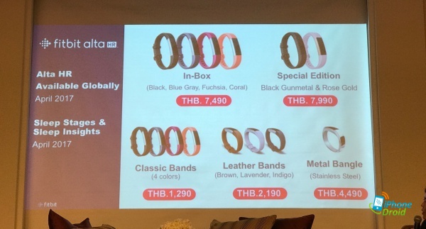 Fitbit Alta HR วางแล้วทั่วประเทศใน ราคา 7,490 บาท โดยมีให้เลือก 4 สี ได้แก่ สีดำ สีฟ้าเทา สีส้มคอรัล และสีชมพูฟิวเซีย ที่ตัวแทนจำหน่ายของฟิตบิท อาทิ บานาน่า ไอที .Life (ร้านดอทไลฟ์) เจมาร์ท คิงพาวเวอร์ บีทูเอส พาวเวอร์บาย ไอทีซิตี้ ร้านทรูช็อป Fitbit Thailand by TSM Koan.co.th Lazada.co.th Central.co.th Bemynt.com Tohome.com Proflexy.com และ avarinshop.com และเตรียมพบกับสายแอคเซสเซอรี