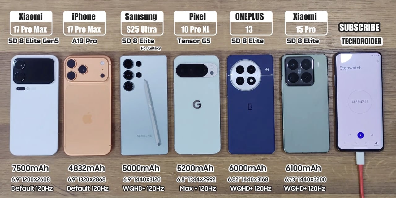 ช่อง Techdroider ทำคลิปเปรียบเทียบแบตเตอรี่ของเรือธงชุดใหม่ออกมาให้เรารับชมกันอีกแล้วครับ รอบนี้มี 2 เรือธง Pro Max อย่าง Xiaomi 17 Pro Max และ iPhone 17 Pro Max มาร่วมทดสอบกันด้วย ซึ่งผลลัพธ์แอบเซอร์ไพรส์อีกแล้วครับ!