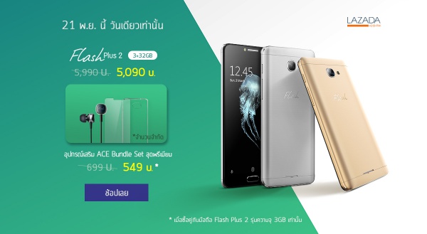 Flash (ประเทศไทย) ร่วมกับ บริษัท ลาซาด้า จำกัด (ประเทศไทย) จัดโปรโมชั่นสุดเร้าใจรับลมหนาวกับแคมเปญส่งเสริมการขาย ”Online Super Sales” โปรแรงได้สองต่อ ในวันจันทร์ที่ 21 พฤศจิกายนที่จะถึงนี้ กับการลดราคาคืนกำไรของสมาร์ทโฟนที่เป็นมากกว่าโลหะ Flash Plus 2 ชูจุดเด่นและคุณสมบัติการใช้งานอันหลากหลาย อาทิเช่น เซ็นเซอร์สแกนลายนิ้วมือ ระบบเสียง Hi-Fi พร้อมกับความสะดวกในการใช้งานกับเอฟเฟคเสียงรูปแบบต่างๆ ประทับใจกับการถ่ายภาพคมชัดด้วยความละเอียดมากกว่า 13 ล้านพิกเซลอีกทั้งระบบการชาร์จแบตเตอรี่ เร่งความปกติมากกว่า 3 เท่า หรือเพิ่มกำลังไฟได้ถึง 50 เปอร์เซนต์ ภายใน 30 นาที มาพร้อมกับขนาดความจุ 3,000 มิลลิแอมป์ ถูกพัฒนาเพื่อแก้ปัญหาในการใช้งานให้เป็นไปอย่างไร้ขีดจำกัด Flash Plus 2 มาใน 2 สีสันที่ทันสมัย สีเงินลูน่า (Luna Silver) และ สีทองวีนัส (Venus Gold) ขนาดความจุ 3/32 GB ปรับราคาลดสูงสุด 5,090 บาท จากราคาปกติ 5,990 บาท