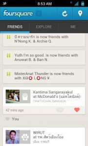 เมื่อเข้ามาในส่วนของแอพแล้วจะพบกับกลุ่มเพื่อน ๆ ของเราที่เช็คอินครับ ซึ่งจะเห็นได้ว่าสิ่งที่เปลี่ยนแปลงไปคือมีรูปหัวใจอยู่ด้วย และเราก็สามารถกดไปที่ หัวใจ เพื่อ like ได้ครับ
