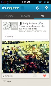 หลังจากเมื่อวาน Foursquare บน iOS ได้ออกอัพเดทใหม่ V.5.0 ครับซึ่งในเวอร์ชั่นนี้บน iOS ได้เปลี่ยน UI ใหม่ทั้งหมด เท่าที่ทดสอบใช้งานโดยรวมถือว่าทำได้ดีมากครับ น่าใช้กว่าเวอร์ชั่นก่อน ๆ มากเลยทีเดียว สำหรับใครที่อาจจะยังไม่เคยใช้งานเลย Foursquare คือแอพพลิเคชั่นที่ใช้ในการเช็คอินบอกสถานที่ต่าง ๆ ที่เราอยู่ ณ ขณะนั้นครับ และเรายังสามารถแชร์ไปยังให้เพื่อน ๆ ของเราได้รู้ได้อีกด้วยครับ และยังมี badge หรือตราสัญลักษณ์ให้เราได้เก็บสะสมกันอีกด้วย