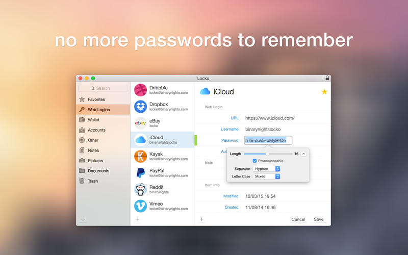 Locko – password manager and file vault แอพสำหรับเก็บ password สำหรับบริการต่างๆ ที่เราใช้งานอยู่ครับ เวอร์ชั่นนี้สำหรับ Mac ปกติ $19.99
