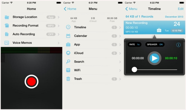 Recording-Professional Recorder แอพสำหรับบันทึกเสียงสามารถเลือกไฟล์นามสกุลได้ทั้ง mp3, aac, amr ได้เป็นต้น สามารถ export ไฟล์ผ่าน wifi, iTunes ปกติ $4.99 ฟรีจำกัดเวลา