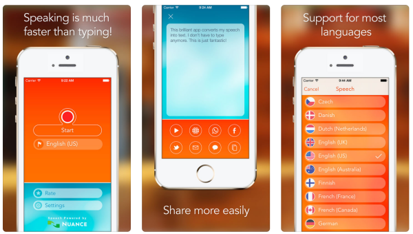Speech Recogniser: Convert your voice to text with this dictation app.และ Speech Recogniser HD แอพสำหรับแปลงเสียงพูดให้เป็นข้อความ หลังจากที่ได้เป็นข้อความตัวอักษรมาแล้วสามารถแปลงเป็นภาษาอื่นๆ ได้ด้วยครับ มีประโยชน์มากๆ สำหรับแอพนี้ แอพเวอร์ชั่น iPhone ปกติ $9.99, iPad $11.99