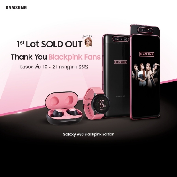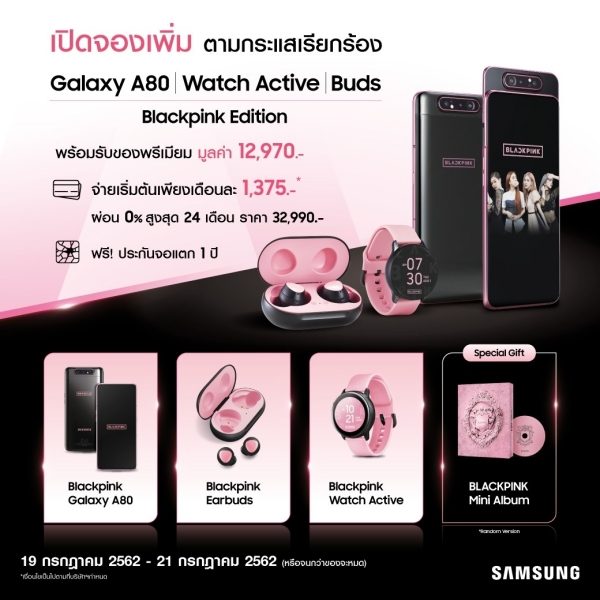 นี่คือโอกาสสุดท้ายที่คุณจะได้ครอบครองสมาร์ทโฟนรุ่นพิเศษในดีไซน์สุดเอ็กซ์คลูซีพ เนื่องจากซัมซุงใจดีขยายเวลาจองเพิ่มตามกระแสเรียกร้องของเหล่าแฟนคลับแบล็กพิ้งก์ ในระหว่างวันที่ 19-21 กรกฎาคม 2562 โดย 4ความพิเศษที่คุณจะได้รับจากชุด “Galaxy A80 Blackpink Edition” ได้แก่ 1. ตัวเครื่อง กาแลคซี่ เอ 80 รุ่นพิเศษ Blackpink Edition เครื่องสีดำ-ชมพู ที่มีโลโก้ Blackpink อยู่ด้านหลังเครื่อง รวมถึงธีม, อนิเมชั่นเปิดเครื่องสุดพิเศษ, และสติ๊กเกอร์สุดน่ารักของสาวๆ Blackpink ลายพิเศษที่มีเฉพาะในเครื่องรุ่นนี้เท่านั้น 2. นาฬิกา Samsung Galaxy Watch Activeสีดำชมพู 3. หูฟัง Galaxy Buds สีพิเศษ ดำชมพู และสุดท้าย 4. Blackpink Mini Album “Kill this love” random version