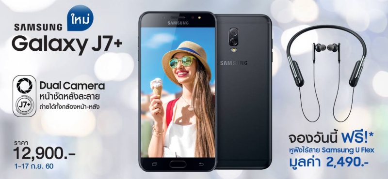 Galaxy J7+ มาพร้อมโปรโมชั่นสุดคุ้ม แถมฟรีหูฟัง Samsung U Flex มูลค่า 2,490 บาท พิเศษ!!! สำหรับลูกค้าที่จองสินค้าผ่าน Samsung Brand Shop จะได้รับ Soft Cover สี Clear มูลค่า 390 บาท สนใจสั่งจอง คลิกเลย http://www.samsung.com/th/microsite/2017/galaxyj/#prebooking
