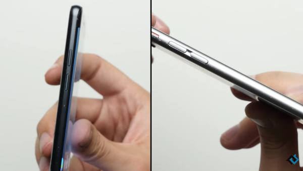 การทดสอบแรกเป็นการปล่อยตกให้ด้านหลังเครื่องของทั้ง 2 รุ่นตกกระแทกพื้น โดยตัวเครื่องโลหะของ iPhone 6s เกิดรอยบริเวณขอบเครื่อง ในขณะที่ตัวเครื่องกระจกของ Galaxy Note7 เกิดการแตกร้าวบริเวณมุมขอบเครื่อง