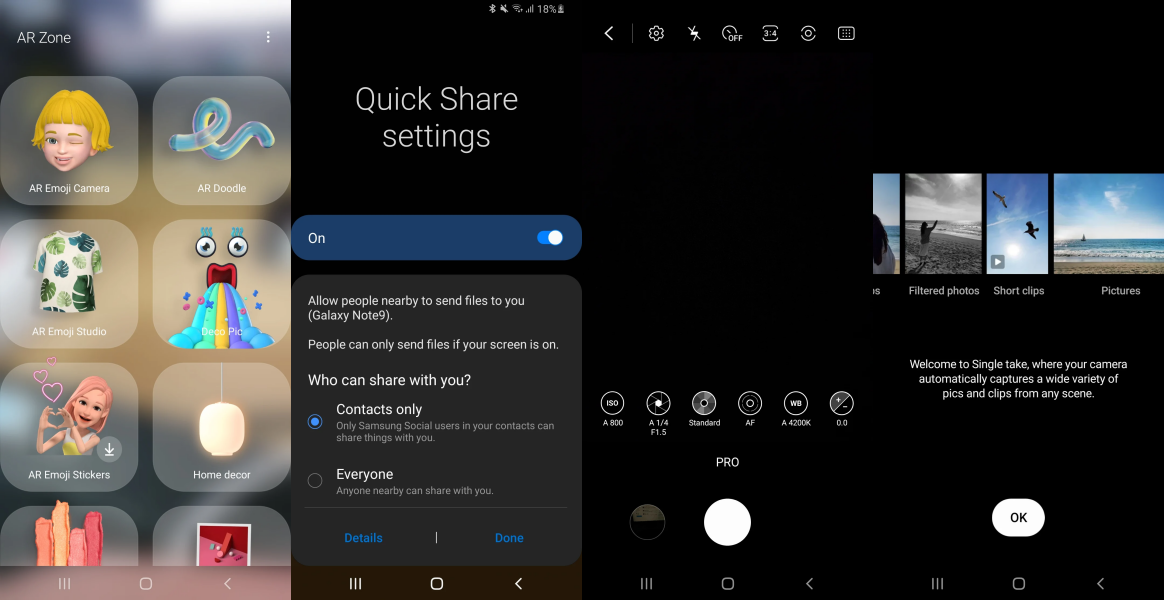ฟีเจอร์ใหม่ที่ Galaxy Note 9 จะได้มีทั้ง Quick Share ที่เป็นการแชร์ไฟล์ต่างๆ ผ่าน Bluetooth ได้รวดเร็ว, โหมดกล้อง Single Take ที่จะเก็บทั้งภาพและวิดีโอหลายช็อตให้เลือกเพียงคลิกเดียว, Pro Mode ในวิดีโอก็กลับมาแล้ว หลังจากหายไปใน One UI 1.0 และ AR Zone ที่นำเทคโนโลยี AR ต่างๆ เข้ามาเพิ่มเติม เช่น AR Emoji และ AR Doodle
