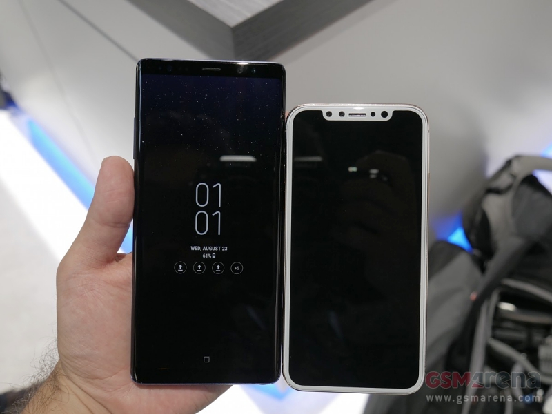 Galaxy Note8 สมาร์ทโฟนจอใหญ่รุ่นใหม่ล่าสุดจาก Samsung ที่เพิ่งเปิดตัวกันไปสดๆ ร้อนๆ มีขนาดตัวเครื่อง 162.5 x 74.8 x 8.6 มิลลิเมตร ในขณะที่ตัวเครื่องดัมมี่ iPhone 8 มีขนาด 143.5 x 71 x 7.5 มิลลิเมตร ซึ่งเล็กกว่า Note8 มาก ทั้งขนาดตัวเครื่องและหน้าจอแสดงผล แต่ดีไซน์หน้าจอแสดงผลเป็นเทรนด์เดียวกันคือ Full Display เต็มพื้นที่ด้านหน้า