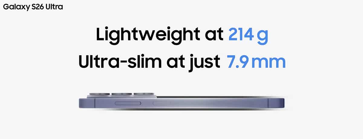 ตัวเครื่องที่บางและเบาที่สุดของ Galaxy S Ultra ด้วยความบางแค่ 7.9 มม.และน้ำหนักแค่ 214 กรัมเท่านั้น