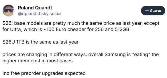 จอมหลุด Roland Quandt เผยว่าราคา Galaxy S26 และ S26+ ยังคงราคาเท่าเดิมกับ S25 และ S25+ ของปีที่แล้ว แม้ว่าจะมีข่าวเรื่องชื้นส่วนชิปที่ราคาสูงขึ้นก็ตาม ดังนั้น ราคาฝั่งยุโรปรุ่น S26 จะเริ่มต้นที่ €899 (ประมาณ 33,600 บาท) และ S26+ จะเริ่มต้นที่ €1,169 (ประมาณ 43,600 บาท)