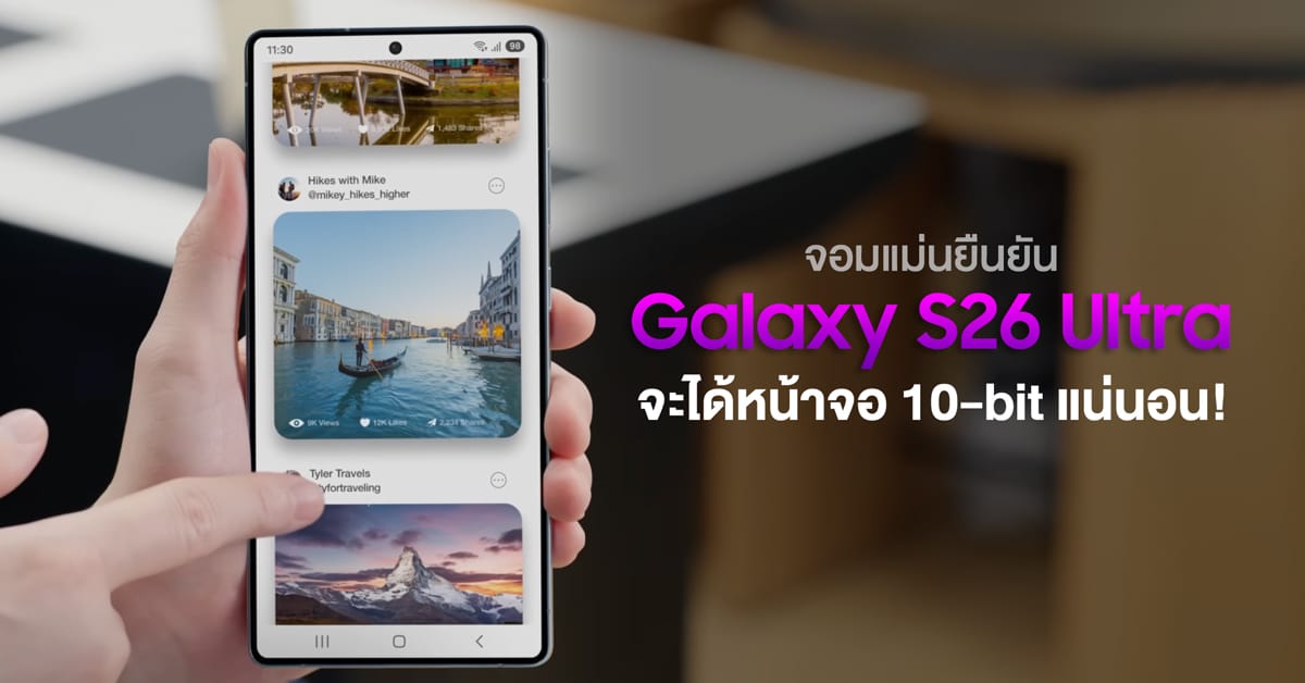 หน้าจอของ Galaxy S26 Ultra ดูจะมีการอัปเกรดครั้งใหญ่มาก ๆ ในปีนี้ เพราะนอกจากเรื่องพาเนลใหม่อย่าง M14 OLED COE ที่ลือกันแล้ว ยังมีข้อมูลใหม่ว่ารอบนี้ Samsung จะอัปเกรดจอเป็น 10-bit ให้สักที หลังจากที่ให้แฟน ๆ ต้องรอคอยกันมานาน!