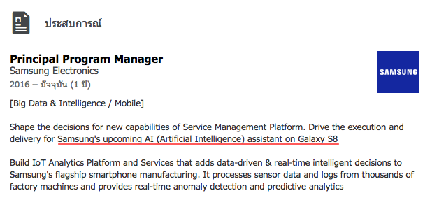 ข้อมูลดังกล่าวมาจากโปรไฟล์ LinkdIn ของ June K. Sung ผู้จัดการฝ่ายงาน Big Data & Intelligence อุปกรณ์มือถือของซัมซุงอิเล็กทรอนิกส์ ได้ระบุประสบการณ์ในการทำงานของตนเองไว้ว่าปัจจุบันเป็นผู้จัดการโครงการใหม่เกี่ยวกับแพลตฟอร์มการจัดการบริการสำหรับเทคโนโลยีปัญญาประดิษฐ์ (AI) ที่กำลังจะมา ซึ่งเป็นผู้ช่วยของ Samsung Galaxy S8