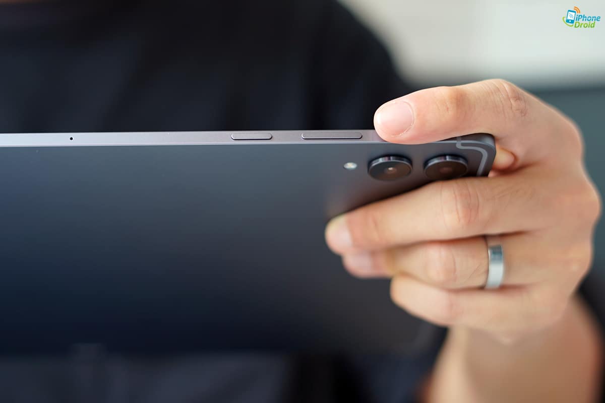 การวางตำแหน่งของ Galaxy Tab S11 Ultra ถือว่าทำได้ดีเหมือนเดิมครับ มีปุ่มเพิ่ม-ลดเสียงอยู่ที่ด้านบนของตัวเครื่องเมื่อจับถือใช้งานในแนวนอน ซึ่งเวลาเราตั้งหรือถือเครื่องก็จะอยู่ในมุมขวาที่กดได้ถนัดครับ