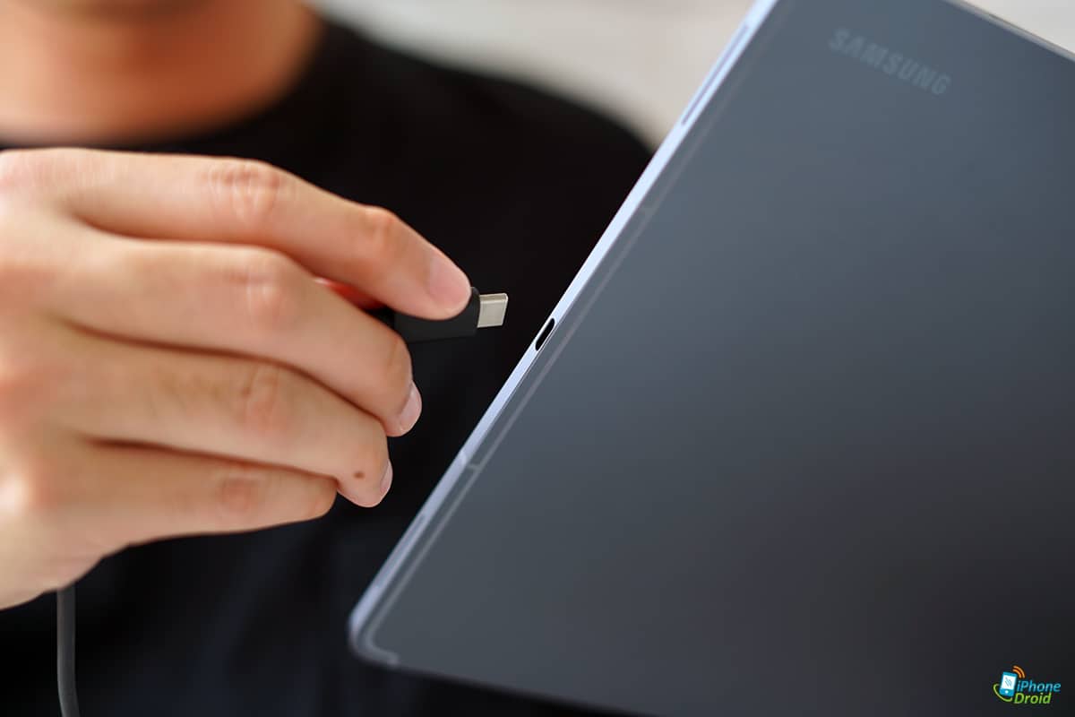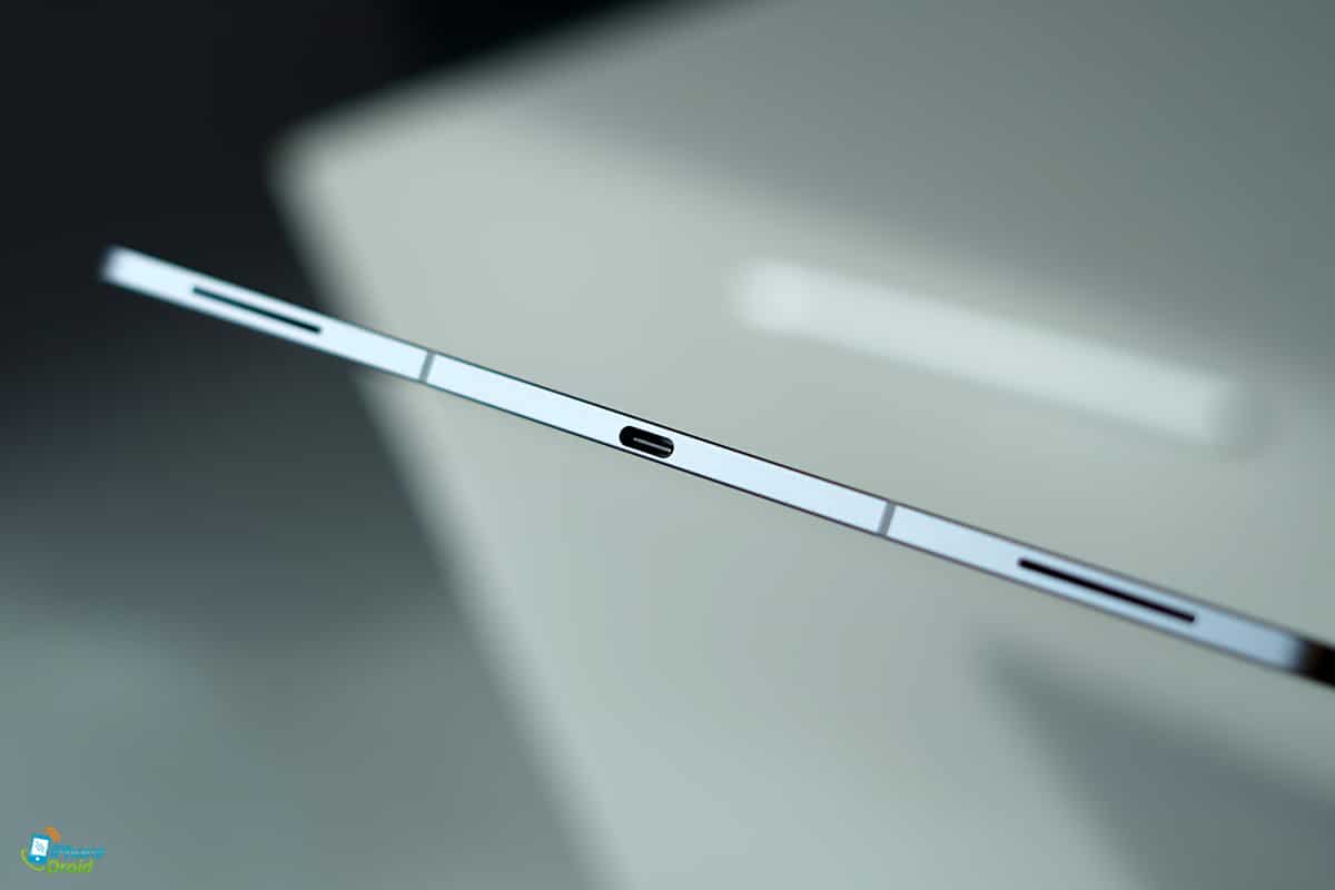 พอร์ตการเชื่อมต่อก็จะอยู่ที่ด้านล่างตัวเครื่อง หรือถ้าถือเครื่องในแนวนอนก็จะอยู่ฝั่งขวามือ ให้เสียบชาร์จหรือเชื่อมต่อกับอุปกรณ์เสริมได้แบบเข้ามือพอดีเลย