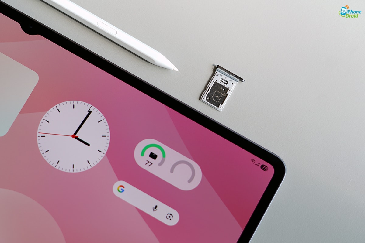 และมุมขวาด้านบนของตัวเครื่องก็จะมีช่องใส่ซิมสำหรับรุ่น 5G ที่มาพร้อมช่องใส่ microSD ด้วย รองรับสูงสุดถึง 2TB เลยนะ