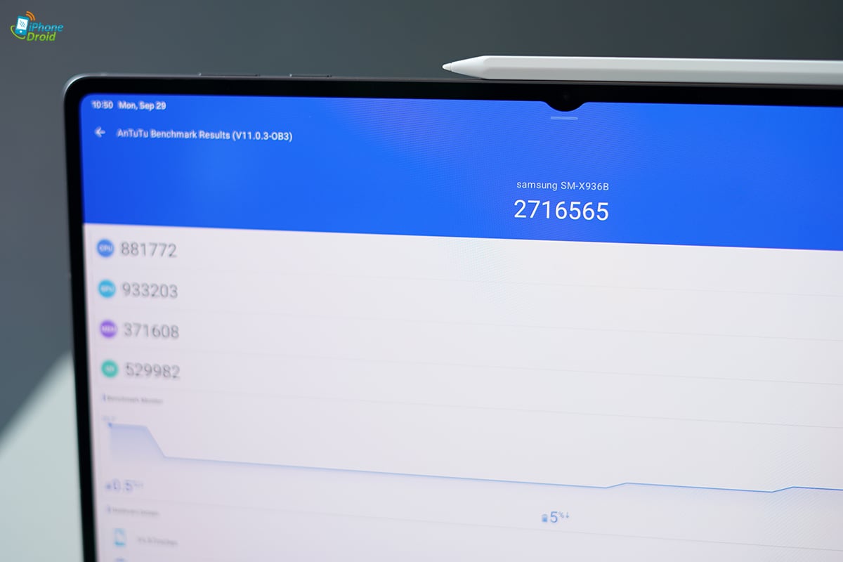เพื่อให้เห็นภาพของประสิทธิภาพที่ Galaxy Tab S11 Ultra คร่าว ๆ เราลองทดสอบผ่านแอป Benchmark ให้เห็นคะแนนจาก AnTuTu Benchmark กันหน่อย ซึ่งคะแนนก็บอกเลยว่าสูงจริง ๆ ได้ไปถึง 2716565 คะแนนกันเลย แรงมาก!