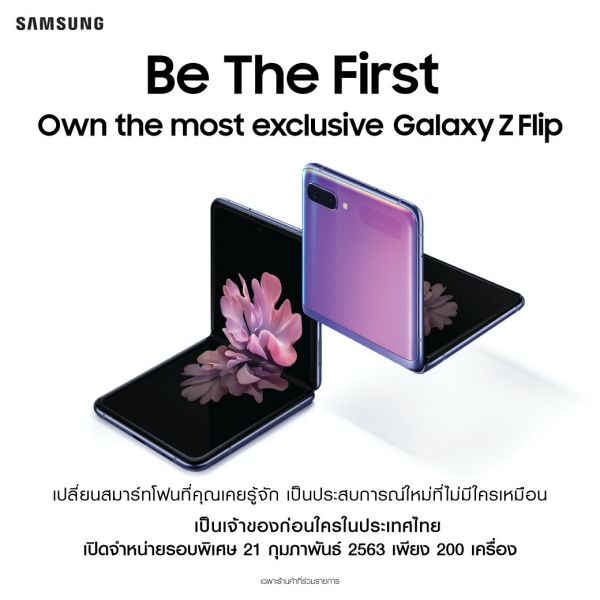 สำหรับใครที่สนใจ ซัมซุงเปิดจำหน่าย Galaxy Z Flip รอบพิเศษ ให้คุณเป็นเจ้าของสมาร์ทโฟนพับได้ดีไซน์สุดล้ำก่อนใครในประเทศไทย ในวันศุกร์ที่ 21 กุมภาพันธ์ 2563 จำนวนจำกัดเพียง 200 เครื่องเท่านั้น ที่ Samsung Experience Store 10 สาขา ได้แก่ สาขาเซ็นทรัลเวิลด์, สยามพารากอน, เอ็มควอเทียร์, เซ็นทรัลพลาซา ลาดพร้าว, เซ็นทรัลพลาซา ปิ่นเกล้า, เซ็นทรัลพลาซา แกรนด์ พระราม 9, เมกาบางนา, เดอะมอลล์บางกะปิ, แฟชั่นไอส์แลนด์ และ เซ็นทรัลเฟสติวัล พัทยาบีช หรือสามารถสั่งซื้อได้ทาง Samsung Online Shop และออนไลน์สโตร์ของผู้ให้บริการเครือข่าย ในราคา 44,900 บาท มาในสีม่วง Mirror Purple และสีดำ Mirror Black สามารถดูรายละเอียดผลิตภัณฑ์เพิ่มเติมได้ที่ www.samsung.com/th/galaxy-z-flip