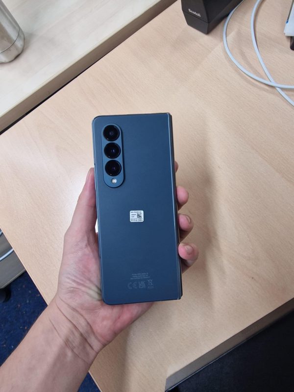 Galaxy Z Fold4 ในสีเทาดูมีความหรูหราดีมาก และสังเกตจากตัวหน้าจอด้านนอกมีความกว้างมากขึ้นชัดเจน น่าจะใช้งานได้สะดวกขึ้นเมื่อเทียบกับรุ่นก่อน