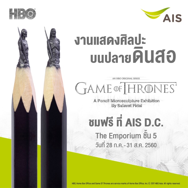 ล่าสุด AIS จับมือกับ HBO ASIA ต่อยอดประสบการณ์ความมันส์ให้กับแฟนๆ ชาวไทย ผู้ชื่นชอบซีรีส์ “Game of Thrones” นำสุดยอดงานศิลปะระดับโลก “Game of Thrones A Pencil Microsculpture Exhibition in Bangkok” (#GOTPencilArt) เข้ามาจัดแสดงในประเทศไทยเป็นครั้งแรก และครั้งเดียว พบกับผลงานแกะสลักประติมากรรมขนาดจิ๋ว ลงบนไส้ดินสอกราไฟต์ เป็นรูปสัญลักษณ์ และตัวละครจากซีรีส์ Game of Thrones โดย “ซาลาวัต ฟิได” ศิลปินชั้นนำชาวรัสเซีย ซึ่งเป็นที่ยอมรับทั่วโลกถึงฝีมือการแกะสลักงานศิลป์ขนาดย่อส่วน โดยเปิดให้ประชาชนทั่วไปเข้าชมฟรี! ตั้งแต่วันที่ 28 ก.ค. – 31 ส.ค. 60 ณ AIS D.C. ชั้น 5 ศูนย์การค้าดิเอ็มโพเรียม