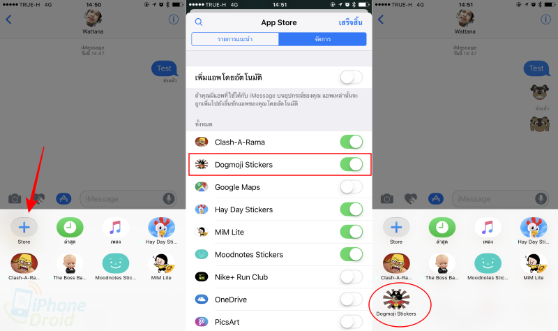 - ในหน้า App Store ให้เข้าไปที่แท็บ จัดการ แล้วแตะเปิดใช้งาน Dogmoji Stickers เพียงเท่านี้ก็สามารถส่งสติกเกอร์เจ้าตูบหน้ายุ่นได้แล้ว