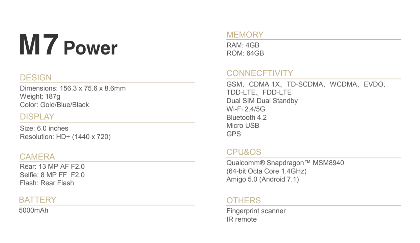 สรุปข้อมูลและสเปค Gionee M7 Power