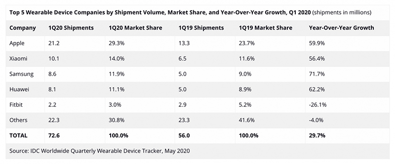 แม้ว่ายอดส่งออกสมาร์ทโฟนจะลดลงอย่างชัดเจน แต่ในตลาดของอุปกรณ์สวมใส่ยังคงโตขึ้นอย่างต่อเนื่องครับ โดยเพิ่มขึ้น 29.7% ในไตรมาสที่ 1 ปี 2020 เมื่อเทียบกับปี 2019 ในช่วงเดียวกัน