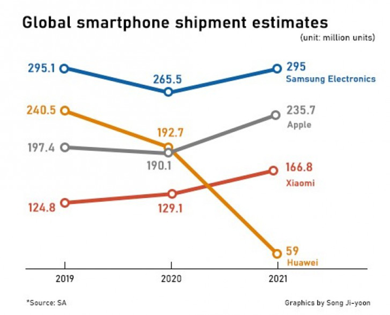 จากการคาดการณ์ Strategy Analytics เผยว่า Samsung จะปิดยอดขายสมาร์ทโฟนปี 2020 ด้วยจำนวน 265.5 ล้านเครื่อง ตามมาด้วย Huawei ที่ 192.7 ล้านเครื่อง, Apple ที่ 190.1 ล้านเครื่อง และอันดับ 4 อย่าง Xiaomi ที่ 129.1 ล้านเครื่อง