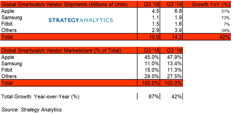 ขณะที่ตลาดสมาร์ทโฟนจะยังคงดูซบเซาไปบ้าง แต่ในฝั่งของนาฬิกาอัจฉริยะหรือ Smartwatch ก็มีการเติบโตขึ้นสูงขึ้นมาก โดยสถิติจาก Strategy Analytics ระบุว่า Smartwatch มีการส่งออกไปแล้วกว่า 14 ล้านเครื่องในช่วงไตรมาสที่ 3 ปี 2019 ซึ่งนับเป็นการเติบโตถึง 42% เมื่อเทียบกับช่วงเดียวกันในปีที่ผ่านมา