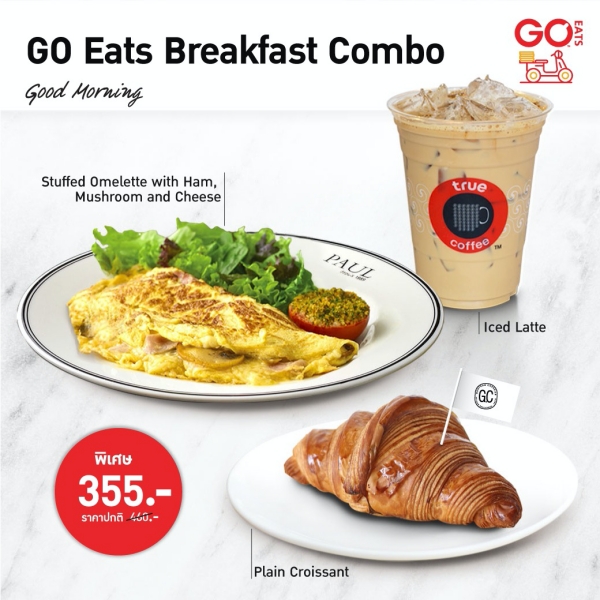 ชุดเมนูอาหารเช้า GO Eats Breakfast Combo เริ่มต้นเช้าวันใหม่ด้วย เมนูออมเล็ตไส้แฮมเห็ดและชีส (Stuffed omelette with ham, mushroom and cheese) จาก Paul เสิร์ฟพร้อม เครื่องดื่มลาเต้เย็น (Iced Latte) กาแฟรสเข้มข้นจากทรูคอฟฟี่ และครัวซองต์ (Plain Croissant) เบเกอรี่โฮมเมดสไตล์ฝรั่งเศสแท้ๆจาก Gontran Cherrier (จากราคาปกติ 460 บาท เหลือเพียง 355 บาท)