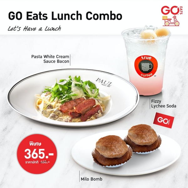 ชุดเมนูอาหารกลางวัน GO Eats Lunch Combo พักจากงานหนักๆ ช่วงเช้ามารับอาหารในมื้อกลางวัน เมนูพาสต้าไวท์ซอสเบคอน (Pasta white cream sauce bacon) สูตรอร่อยเข้มข้นจาก Paul เสิร์ฟความสดชื่นจากเครื่องดื่มรสชาติผลไม้ลิ้นจี่โซดา (Fizzy Lychee Soda) จาก TrueCoffee เต็มอิ่มครบมื้ออาหารด้วยขนมปังเนื้อนุ่มสอดไส้ครีมสดรสไมโล (Milo Bomb) รสชาติเข้มข้นหวานหอมกำลังดีจาก TrueCoffee GO (จากราคาปกติ 460 บาท เหลือเพียง 365 บาท)