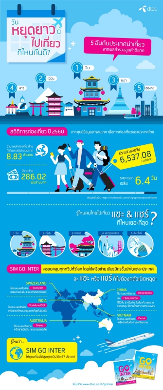 สถิติจากศูนย์ข้อมูลสารสนเทศ เพื่อการท่องเที่ยวของประเทศไทย ในปี 2560 มีจำนวนนักท่องเที่ยวไทยที่ เดินทางไปต่างประเทศ 8.83 ล้านคน มีรายจ่าย286.02 พันล้านบาท ระยะเวลาพำนักเฉลี่ย 6.4 วัน มีค่าใช้จ่ายเฉลี่ย 6,537.08 บาทต่อคนต่อวัน **ข้อมูลเพิ่มเติม https://thailandtic.com/th/graph/outbound/index ในส่วนของลูกค้าดีแทค ประเทศที่ลูกค้าดีแทคนิยมเดินทางท่องเที่ยว 5 อันดับแรก คือ 1. จีน 2. ญี่ปุ่น 3. พม่า 4. ลาว และ อันดับที่5. ฮ่องกง พฤติกรรมของลูกค้าดีแทค ที่เดินทางท่องเที่ยว ใช้เชื่อมต่ออินเทอร์เน็ต มากกว่าโทรเข้าออก โดยลูกค้าดีแทคใช้ดาต้ามากที่สุดใน 5 ประเทศที่เดินทางไป 5 อันดับคือ 1. จีน 2. ญี่ปุ่น 3. เกาหลี 4. สหรัฐอเมริกา 5. สิงคโปร์