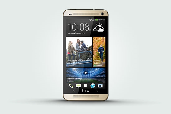HTC One สมาร์ทโฟนหน้าจอขนาด 4.7 นิ้ว, Full HD 1080p, ตัวเครื่องเป็นอลูมิเนียมสีทอง (ไม่ใช่ทองคำแท้) ซีพียู Qualcomm Snapdragon 600 แบบ quad-core ความเร็ว 1.7GHz และกล้อง 4 ล้านพิกเซล Ultrapixels