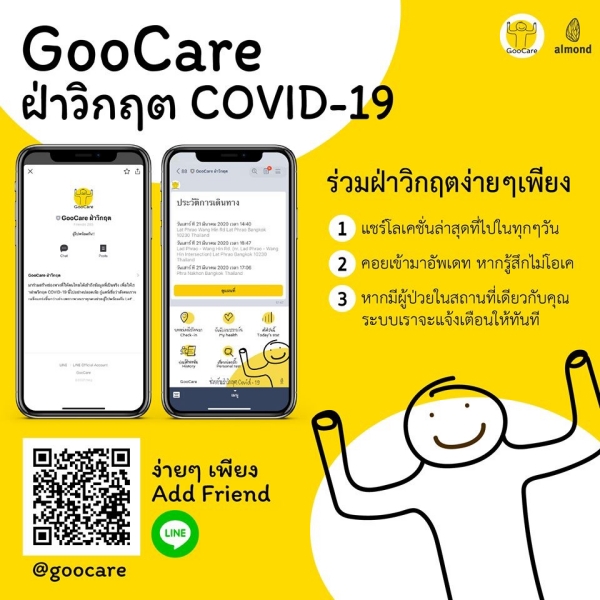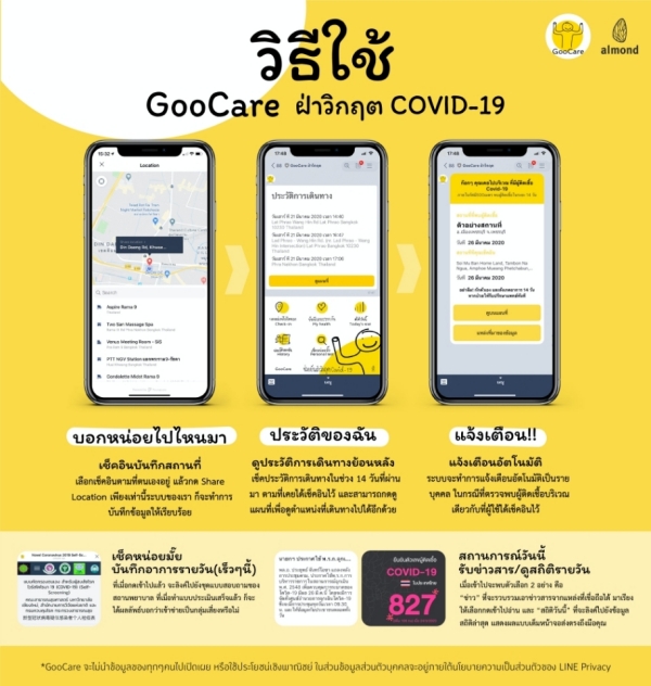 Almond Digital Group บริษัทที่ปรึกษาด้านการพัฒนานวัตกรรมเพื่อเพิ่มมูลค่าธุรกิจด้วยการสร้างประสบการณ์ใหม่ให้กับตลาดและผู้บริโภค หนึ่งในพาร์ตเนอร์ของ LINE Developer พัฒนาแพลตฟอร์มใหม่ล่าสุดใน LINE OA ชื่อ “GooCare” หรือ “กู๋แคร์” ภายใต้แนวคิด “ยิ่งรู้เร็ว ยิ่งลดความเสี่ยงในการแพร่กระจายเชื้อ” มุ่งมั่นฝ่าวิกฤตโควิด-19 โดยระดมทีมงานหัวกะทิพัฒนาแพลตฟอร์มแบบไม่แสวงหาผลกำไร ช่วยบันทึกข้อมูลสถานที่และการเดินทางของผู้ใช้งานแต่ละคน ให้ผู้ใช้งานสามารถจดจำ รวมทั้งไล่เช็กข้อมูลวัน-เวลา-สถานที่ ที่เคยเดินทางได้อย่างแม่นยำ แจ้งเตือนเมื่อมีประวัติเคยเดินทางอยู่ในพื้นที่เสี่ยงของโควิด-19 เพื่อป้องกันการแพร่เชื้ออย่างทันท่วงที พร้อมฟีเจอร์อื่น ๆ ได้แก่ แบบทดสอบความเสี่ยงในการรับเชื้อโควิด–19 บันทึกอาการรายวัน เช็กสถานการณ์โควิด-19 และตรวจสอบประวัติการเดินทางย้อนหลัง โดยเปิดให้ประชาชนใช้งานได้ฟรีแล้ววันนี้ผ่านแพลตฟอร์มของ LINE ล่าสุดได้รับกระแสตอบรับจากผู้ใช้งานแล้วกว่า 100,000 คน หลังจากเปิดใช้งานได้เพียง 6 วัน