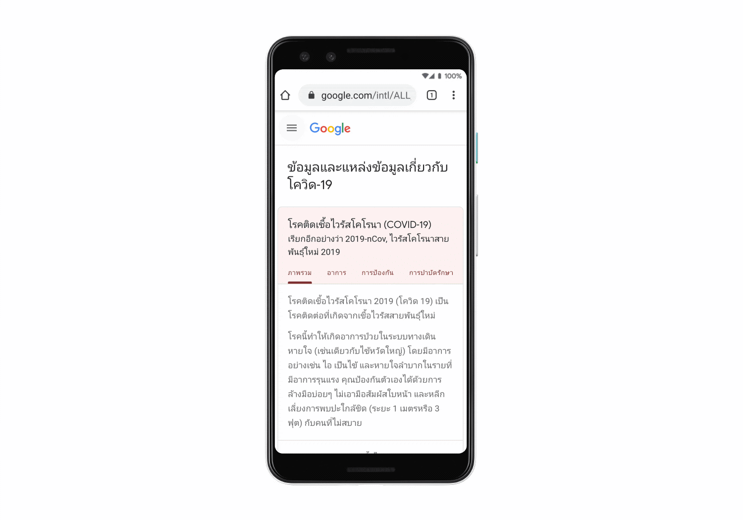 Google ประเทศไทย จัดทำเว็บไซต์ google.com/covid19 ศูนย์รวมข้อมูลและแหล่งข้อมูลเกี่ยวกับโรคติดเชื้อไวรัสโคโรนา (COVID-19) เพื่อช่วยให้ผู้คนสามารถค้นหาข้อมูลที่ถูกต้อง เข้าใจง่าย และนำไปใช้ให้เกิดประโยชน์ในการรับมือกับสถาณการณ์ในปัจจุบัน  โดยเว็บนี้ได้แบ่งออกเป็น 5 ส่วนสำคัญ ได้แก่